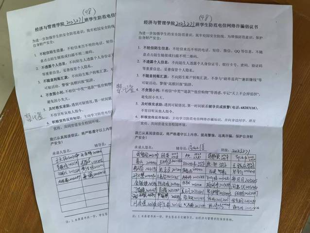 为强化学生自我防范的责任感,学院面向全体学生发起《必赢76net线路官网班学生防范电信网络诈骗倡议书》签署活动,并召开主题班会等号召学生做到“不轻信、不透露、不转账”,并承诺主动学习反诈知识、积极向亲友宣传,同学们纷纷表示将从自身做起,坚决抵制电信诈骗。