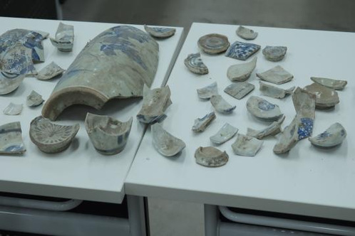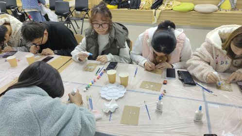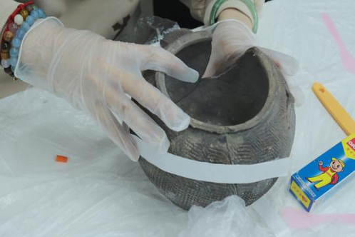 而“修复瓷韵,对话往昔”陶瓷修复活动里,在场学生仿佛化身为时光的“修缮师”,在专业老师的讲解下,仔细观察手中陶瓷碎片的质地、颜色、纹饰,以及破损的程度。实操过程中,同学们先将瓷片放入水中洗净,去除污垢和杂质;随后用胶水将碎瓷片拼接完整,再用打样膏拓出瓷器缺失部分的形状并用石膏填补,待成型后,再用水砂纸细心打磨,使修复处与原瓷片自然融合。
