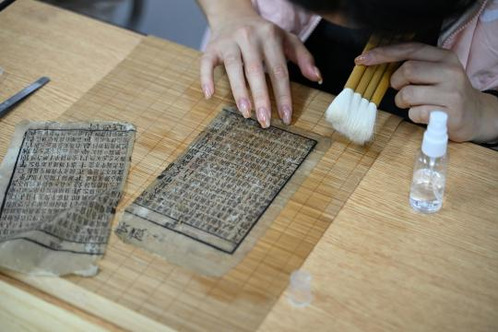 “修复工坊”板块中,工作室与“一站式”学生社区紧密合作,先后开展古籍与陶瓷修复体验活动,吸引了同学们踊跃参与。在古籍修复体验活动“触摸历史,修复时光”中,学生们在专业老师指导下,化身为“古籍修复师”,从前期仔细观察古籍残页的病害状况,如虫蛀、霉变、破损等;到通过毛刷有条不紊地进行清洗,再到最终用滴浆法或补纸法修复残页的破损部分,整个过程仿佛在为古籍重新编织时光的脉络。修复完成后,工坊还融入了创新元素,在场学生充分发挥创意,将修复后的古籍制作成古籍灯、滴胶书签、滴胶杯垫等文创作品。这些独具匠心的文创,让古老的智慧重新焕发光彩。