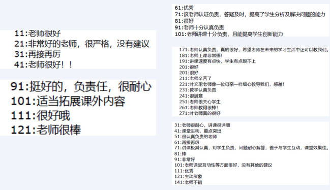 在为学生主动答疑之外,主动“质疑”也是叶文珺老师常用的教学手段。所谓“质疑”,就是主动问学生问题。例如,在批改学生的实验报告等环节中,叶老师经常会主动找学生,指出其实验报告中存在的问题,了解学习中遇到的困难,并加以针对性的辅导。叶老师的辛勤付出,得到了学生的认可,学生们对其每一门课的课程评价都非常高。