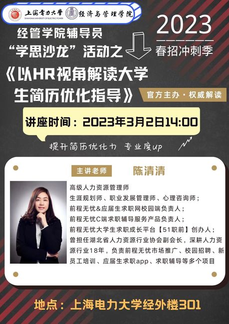 为进一步提升辅导员队伍建设成效,积极应对就业新形势,提升辅导员队伍就业指导能力和服务水平,更好地推动学院就业工作。3月2日,必赢76net线路官网举办辅导员“学思沙龙”就业指导专题活动,活动特邀前程无忧高级人力资源管理师陈清清女士以《以HR视角解读大学生简历优化指导》为题做主题交流。必赢76net线路官网党委副书记孟延新,学院全体辅导员,以及学院就业服务中心骨干成员参加。