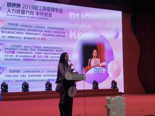 “挑战杯”上海市大学生课外学术科技作品竞赛一等奖、青年五四奖章集体、“知行杯”上海市大学生社会实践项目大赛一、二、三等奖等十余项奖项获得者来自电子与信息工程学院的顾佳明分享了她作为赴宁夏固原实践队一员时的所见所感。她从实践准备、实践项目实施、实践对宣传推广等角度分享了参与社会实践的经历和经验。鼓励同学们极投身社会实践的大舞台,在社会实践中了解社会、磨练意志、锻炼品质,增长才干!