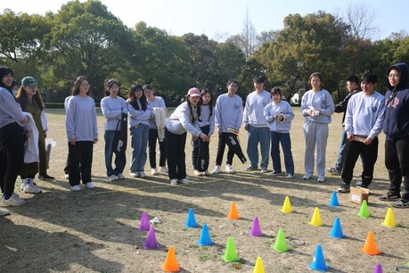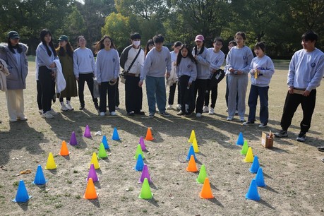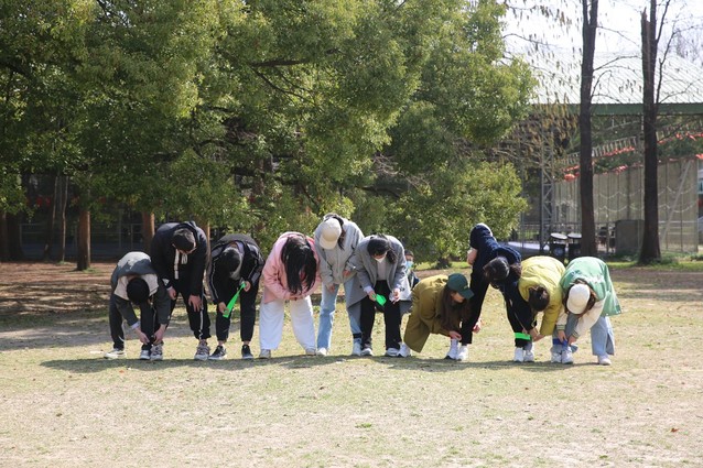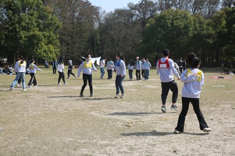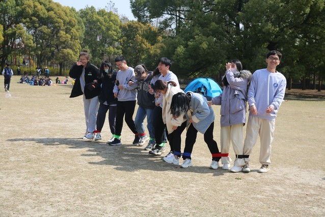 每10人一组,每队成员站成一排,用绳子分别把左腿和右腿绑好,所有人的脚连成“巨脚”并走向终点,最先到达终点的队伍获胜。每轮两组队伍参赛,记录每个队伍到达终点所花费的时间,最后排名。游戏开始之前每个小组都进行了练习,大家的步伐逐渐整齐,在比赛正式开始之后,每组的同学们都手挽着手,肩并着肩,默契十足,拼尽了全力冲向终点。