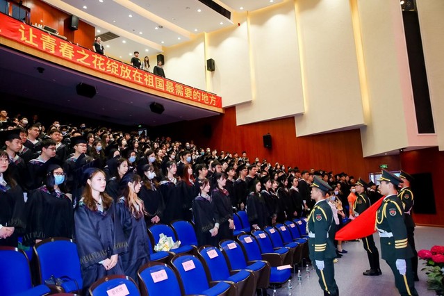 英姿飒爽、落地铿锵。典礼伊始,校国旗护卫队成员护送五星红旗缓缓入场。伴随着庄严的国歌声,毕业典礼拉开帷幕。