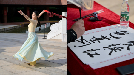 随后,张诗怡同学用一支舞蹈《万疆》展现出新时代青年把美好年华汇入时代旋律、把青春热血融入祖国建设的美好愿景,毛崇宇同志刚劲有力的书法表达了对祖国山河的热爱与眷恋,展现了青年奋发有为的精神面貌。