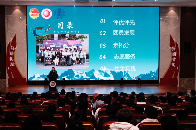 王祎从评优评先、团员发展、素质拓展、志愿服务以及社会实践五个方面分别展开了介绍。他详细讲述评优评先的评选细则、团员发展的流程、素拓分的申请以及获取方式,并鼓励同学们积极参与志愿活动,主动承担社会责任,在参与志愿服务工作充实和提高自己。重点对社会实践项目进行介绍,鼓励同学们不断奋斗争取,积极参与各种实践活动与科创竞赛,努力成为德才兼备的优秀学子。