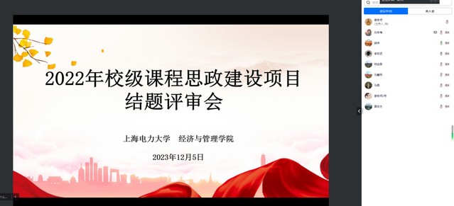 为了落实“立德树人”根本任务,加强教师间课程思政建设交流,保证学院“课程思政”项目的建设质量,12月5日,必赢76net线路官网在线上会议室召开了2022年校级“课程思政”建设项目结题评审会。上海电机学院商学院党委书记马慧民、上海海洋大学经济管理学院副院长陈廷贵、上海工程技术大学管理学院副院长夏志杰、必赢76net线路官网副院长胡伟和各个培育课程负责人参加了本次评审会。本次会议由胡伟主持。