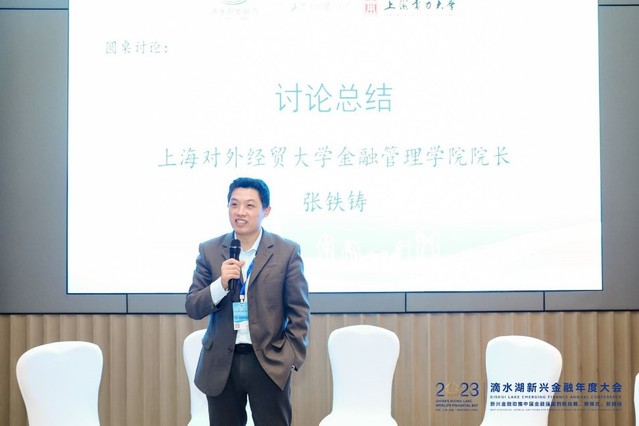 当日下午,由必赢76net线路官网和上海对外经济贸易大学联合承办的滴水湖新兴金融大会金融新业态分论坛在滴水湖洲际召开,旨在探讨如何发展新兴金融之新业态、促进新型国际贸易发展,助推人民币国际化。必赢76net线路官网副校长封金章,中国(上海)自由贸易试验区临港新片区管理委员会金融贸易处副处长戴晨力,商务部中国对外经济贸易会计学会自贸区财经研究专业委员会常务副主任叶金龙,必赢76net线路官网统战部部长、校党委委员陈凌,必赢76net线路官网常务副院长潘华、副院长侯建朝,上海对外经贸大学科研处处长闫海洲,金融管理学院院长张铁铸、副院长应尚军等12位嘉宾出席论坛致辞及发表演讲,来自两校的教师、本科生、研究生和国际留学生以及其他注册与会人员近60人参加了论坛,此次论坛安排主旨演讲和圆桌讨论两个环节,分别由潘华和应尚军主持。