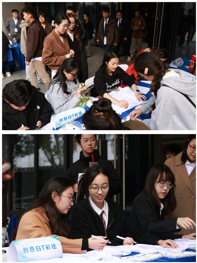 活动现场,毕业生们热情高涨,纷纷拿起画笔,在白T上尽情挥洒创意。不仅将自己在校园生活中的美好回忆、对未来的憧憬以及个人特色融入设计之中,更通过作品表达了对国家、社会和学校的深厚情感。在绘制专属白T的过程中,回望过往,展望未来,以画笔为媒,将青春梦想与爱国情怀融为一体,为成为时代新人积蓄力量,展现青春作为、彰显青春风采。